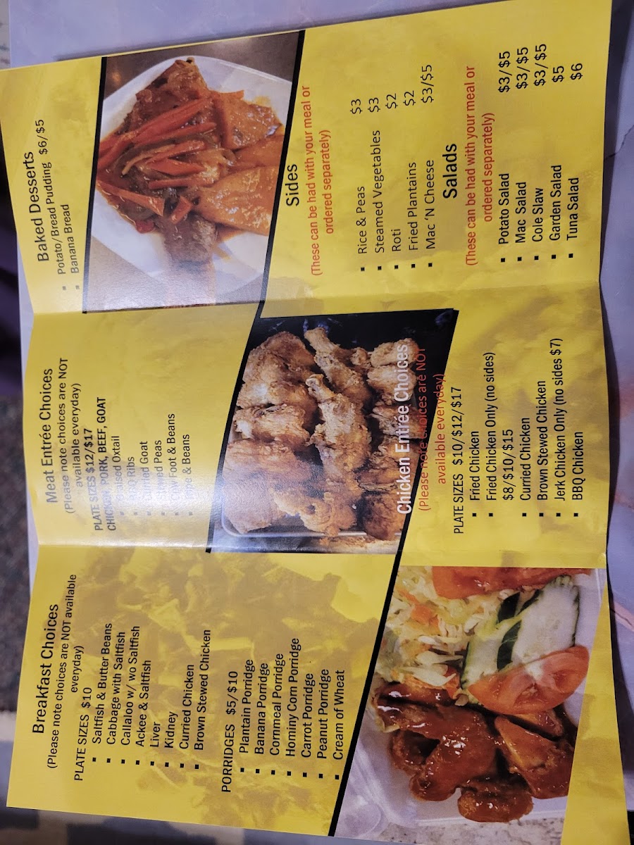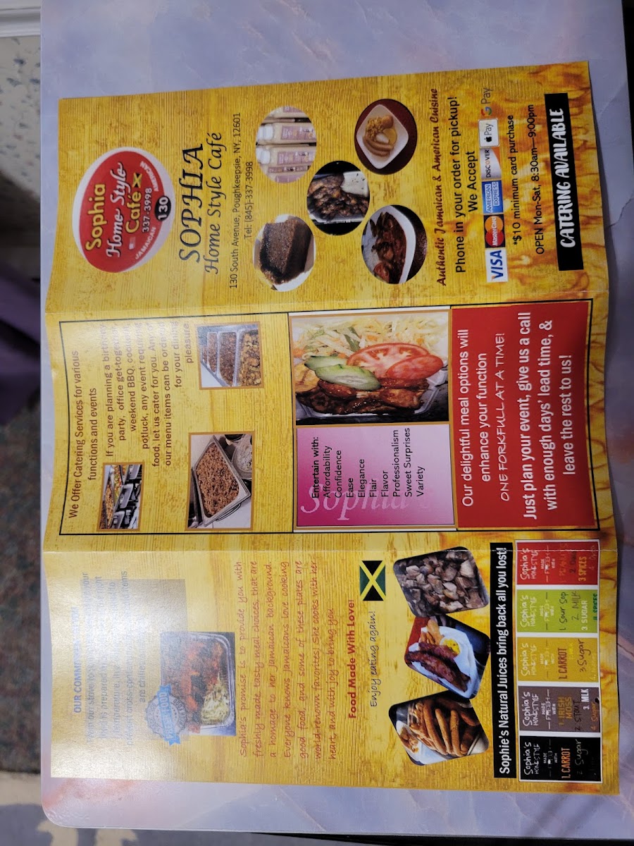 Overall, the menu at Sophia Home Style Cafe offers a comforting and authentic Caribbean experience, with a strong emphasis on hearty, traditional dishes. The rotating availability of items like LG Goat Soup (Fridays) and SM Goat Soup (Fridays) adds a special touch, while weekend favorites such as LG Tripe And Bean Saturday Only and Tripe And Beans Saturday Only highlight the cafe’s commitment to classic recipes. The selection of mains, including MD Oxtail, LG Oxtail, MD Cow Foot, and flavorful chicken options like MD Fry Chicken, Sm Fry Chicken, LG Fry Chicken, Sm Brown Stew Chicken, and LG Jerk Chicken, provides plenty of satisfying choices. Breakfast offerings such as LG Ackee And Saltfish, MD Ackee And Saltfish, Sm Ackee And Saltfish, SM Callaloo, and LG Callaloo showcase traditional morning staples. Complementing the food are refreshing drinks and juices like Beet Root, Irish Mash, Carrot Juice MilkSour Sop, Carrot Natural Juice, along with familiar beverages such as Pure Leaf Sweet, Pure Leaf Raspberry, Arizona Watermelon, Sunkist, and Brisk. Altogether, the menu feels rich, homey, and deeply rooted in Caribbean flavors, making it a satisfying choice for those seeking both variety and authenticity.